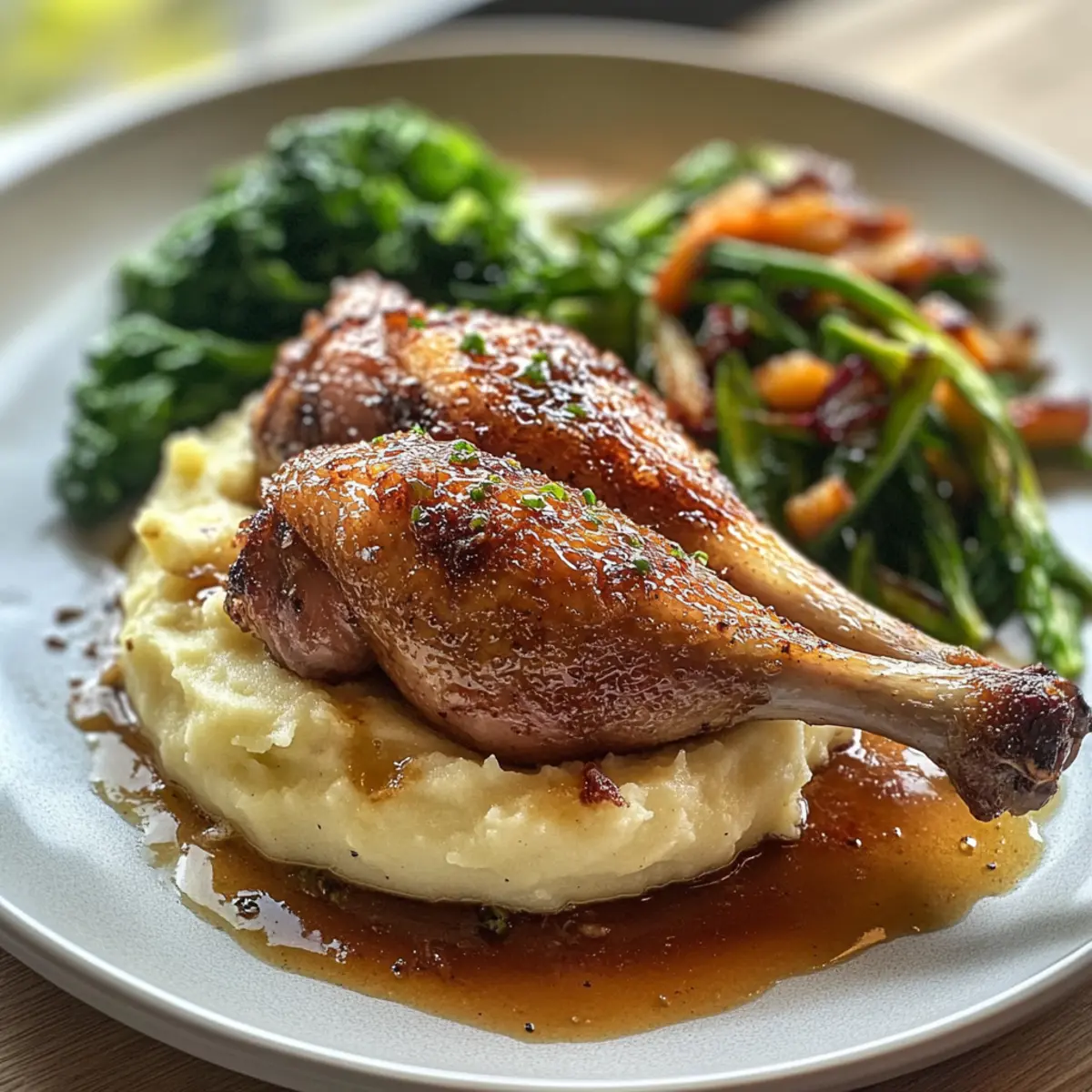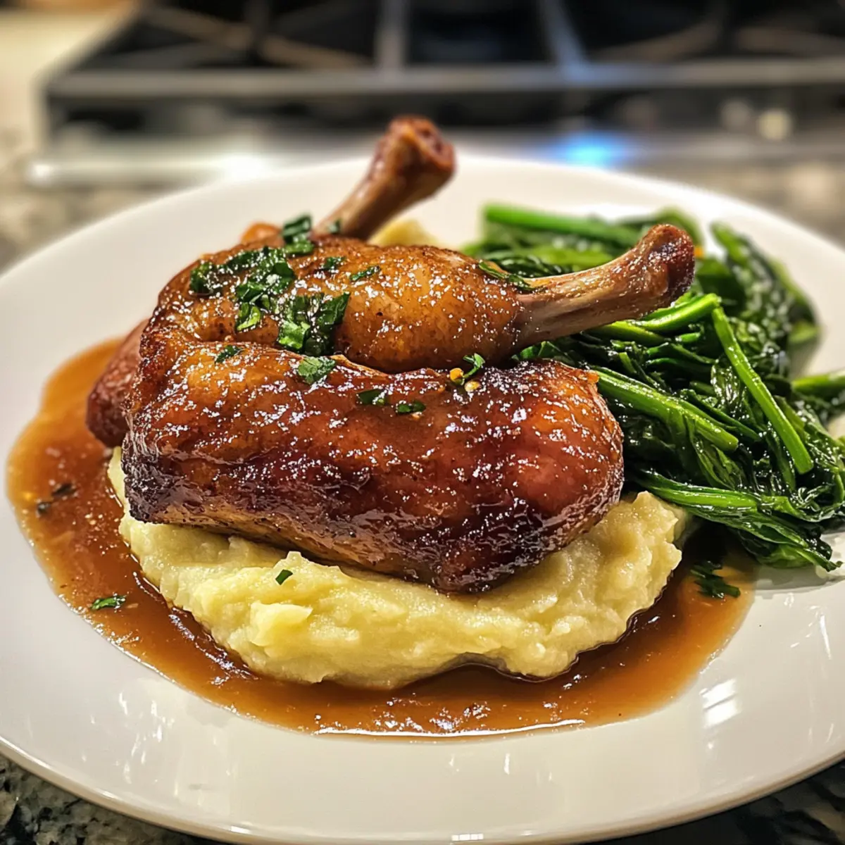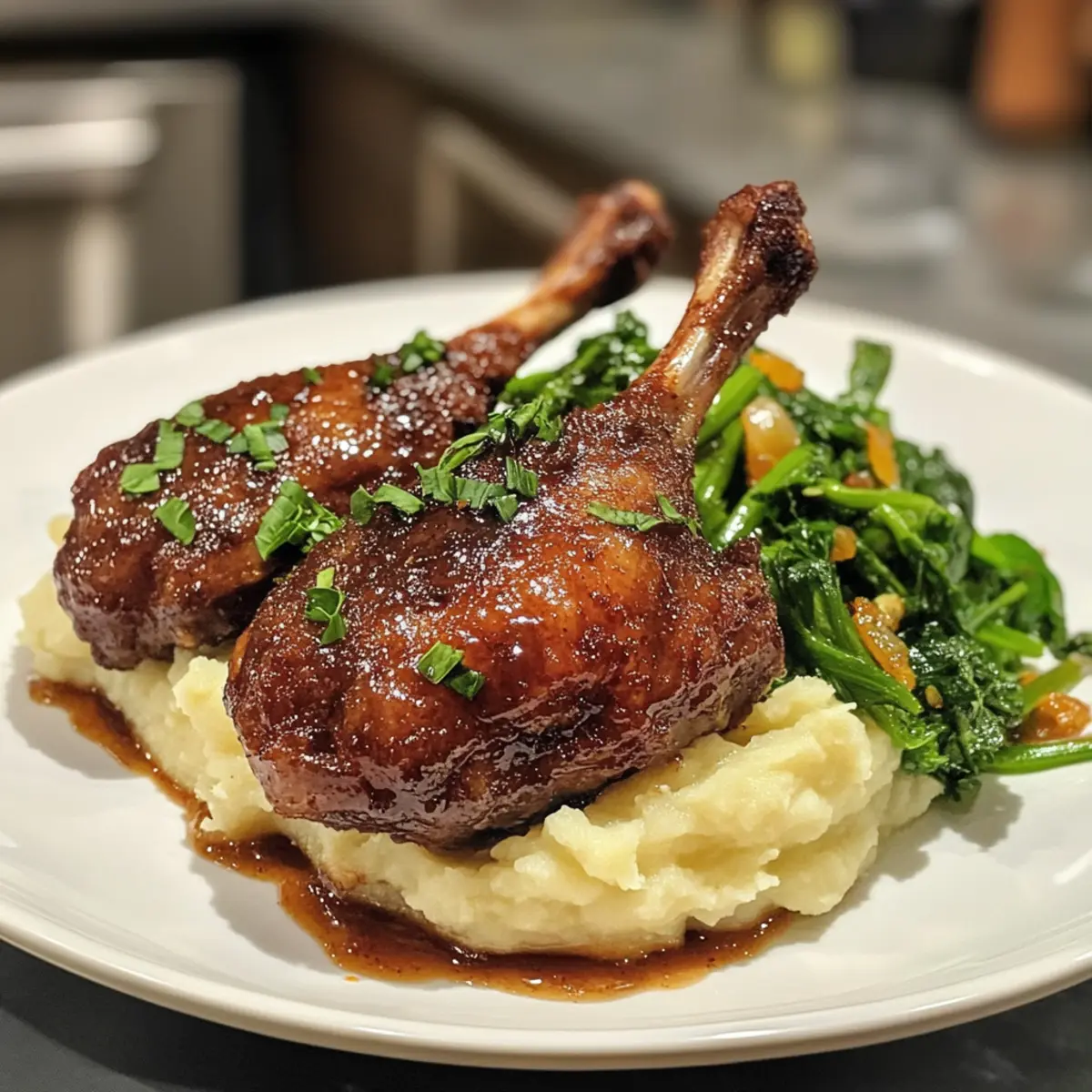 7. In a serving dish, create a bed of creamy celeriac mash, place the duck legs on top, arrange the sautéed greens alongside, and drizzle with citrus glaze.