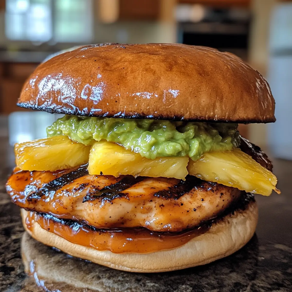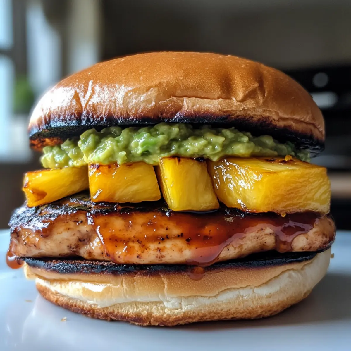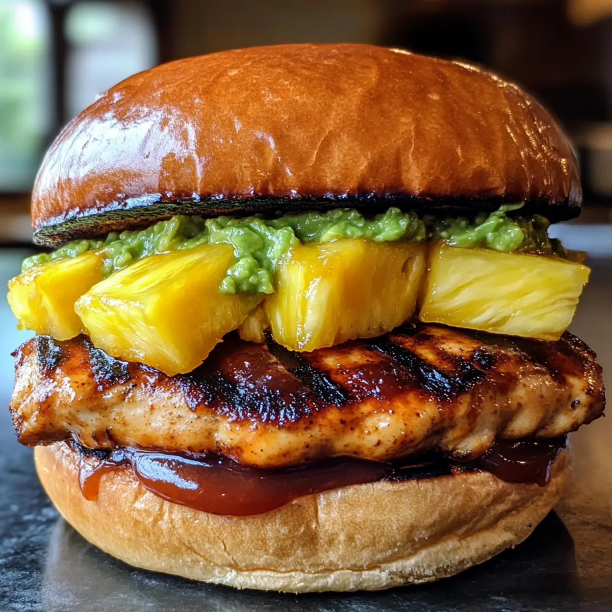 - Assemble the sandwiches with grilled chicken, barbecue sauce, pineapple, mango guacamole, and cheese.