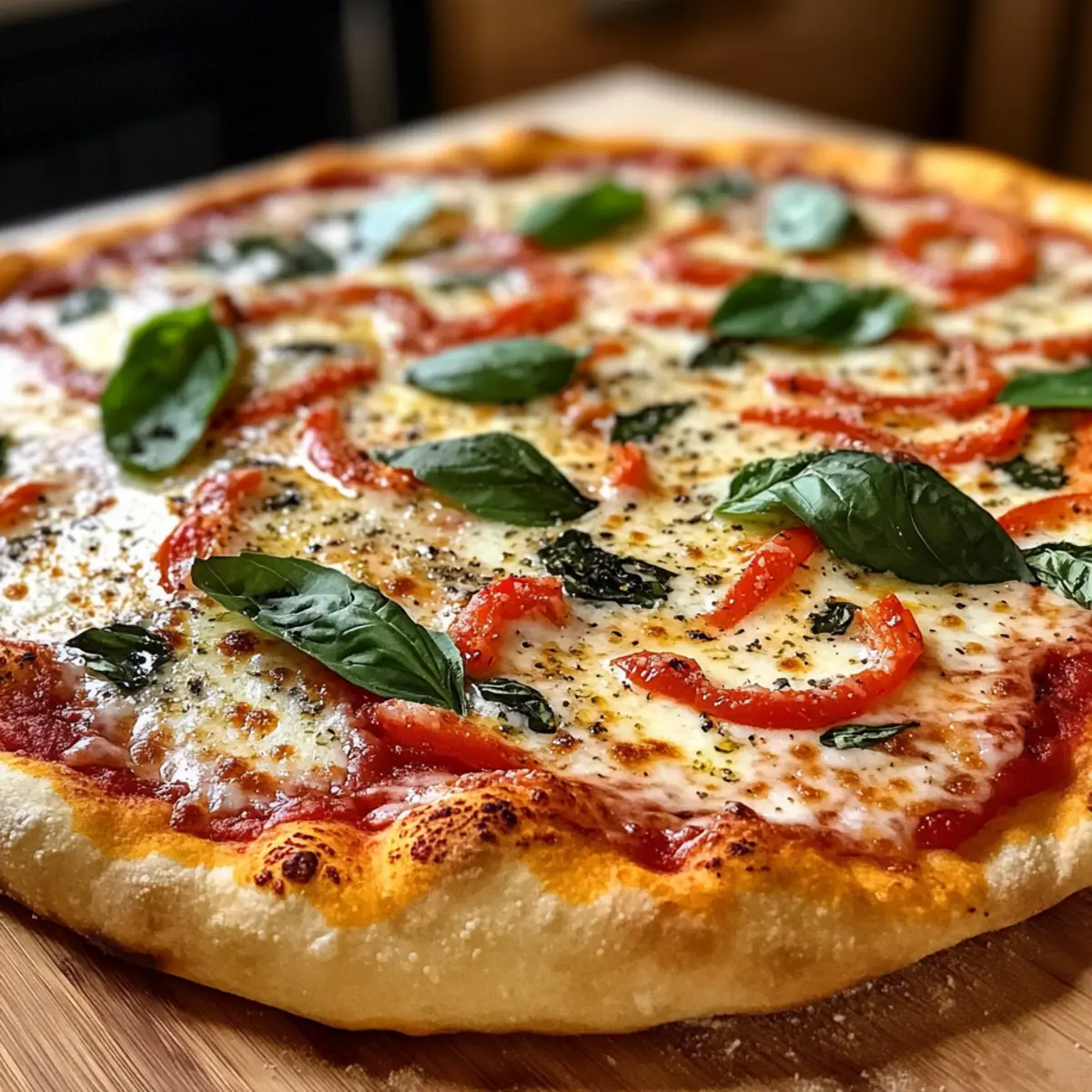 Once out of the oven, let your pizza cool for a minute, then scatter fresh basil leaves over the top. The vibrant green adds not only a pop of color but also a fragrant aroma that enhances the overall experience of enjoying your Calabrian Chili Roasted Red Pepper Pizza.