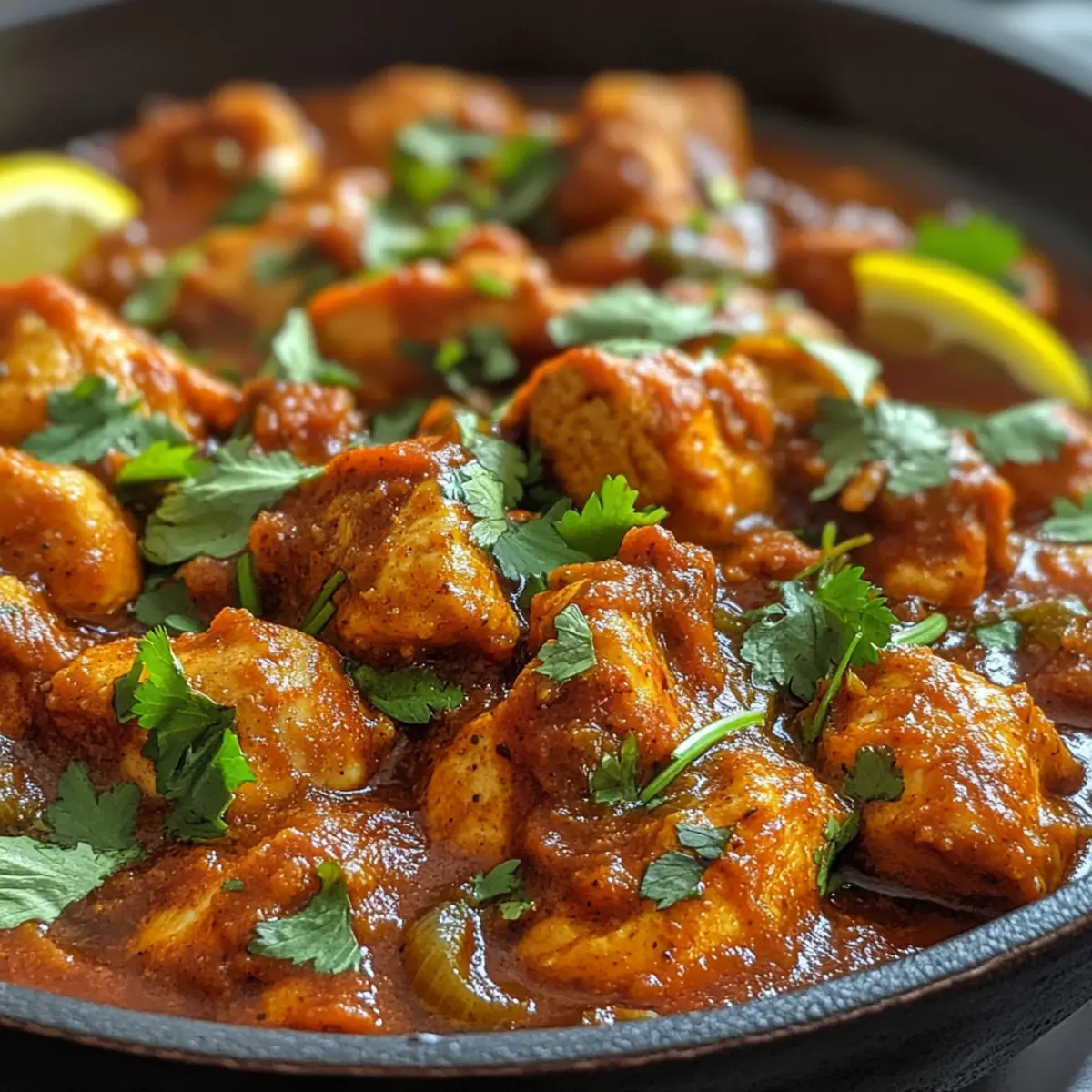 7. Remove from heat and garnish the Chicken Bhuna with freshly chopped cilantro and a squeeze of lemon juice.