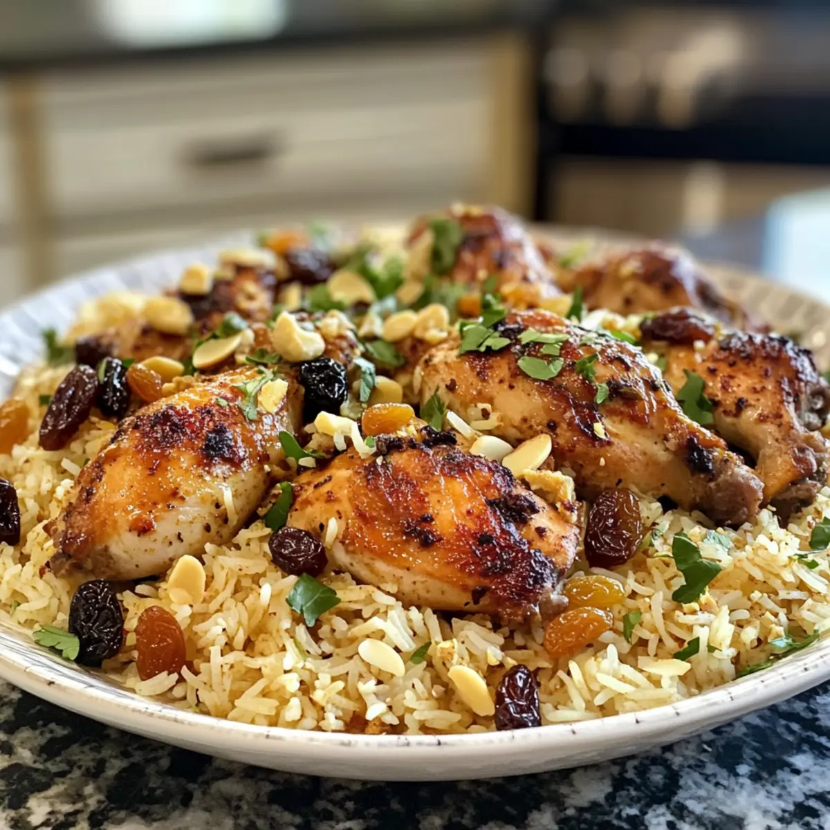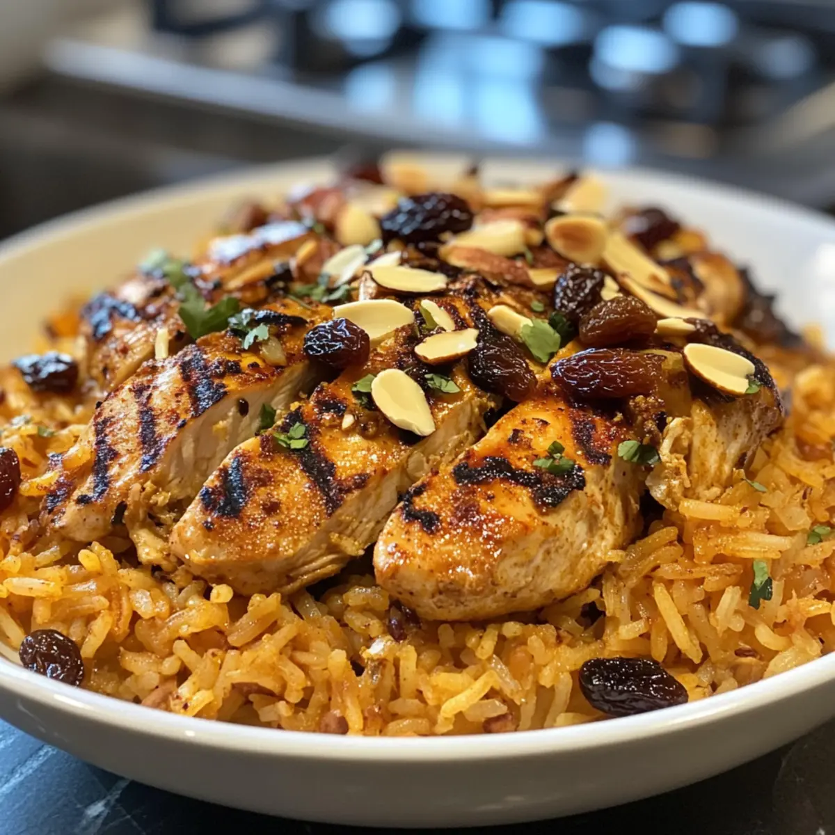 - Serve by fluffing the rice, plating chicken on top, and garnishing with slivered almonds and additional raisins.