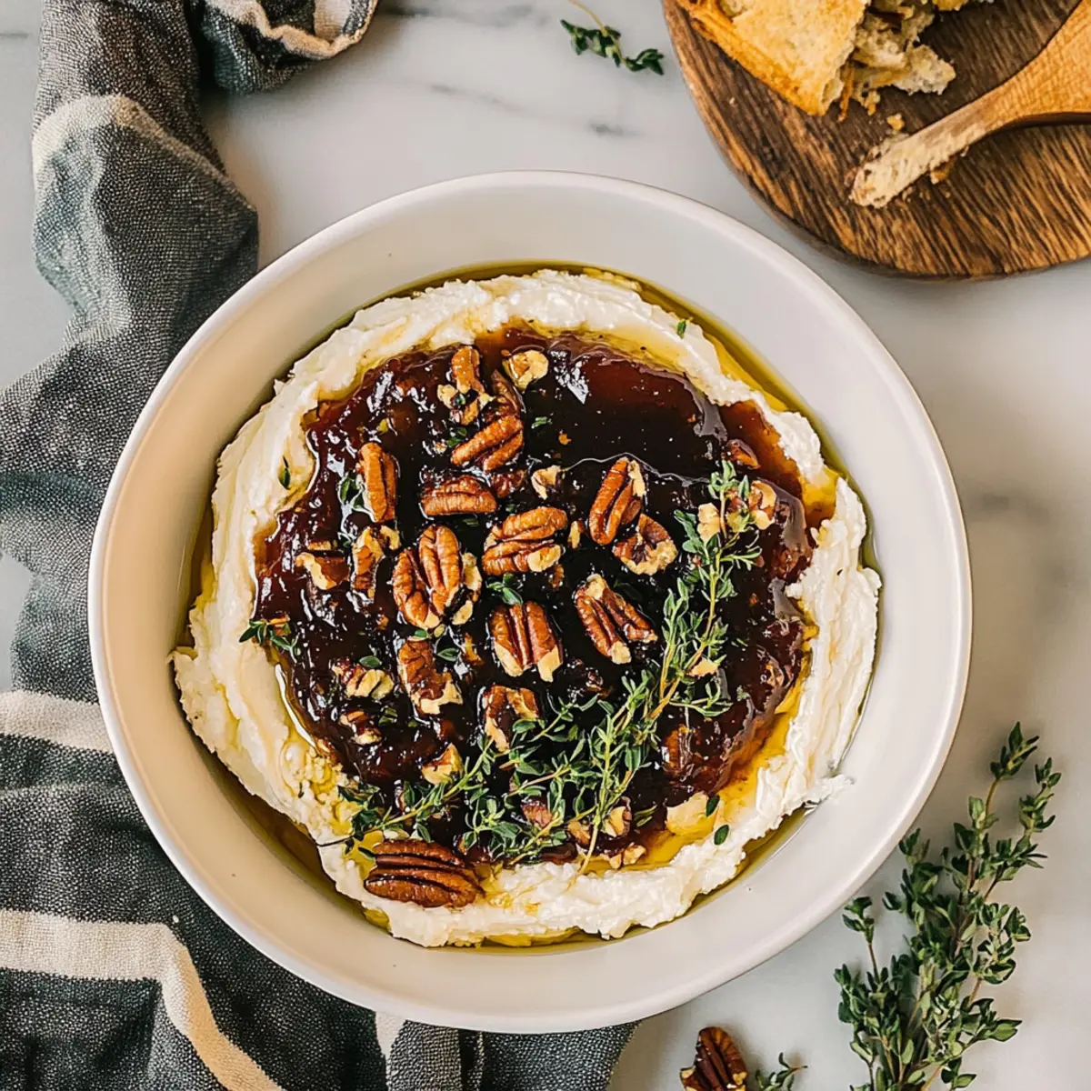 Top the assembled dip with a generous sprinkle of chopped pecans and fresh thyme leaves. The crunchy texture of the pecans and the herby aroma of thyme will elevate your dish, giving it an inviting appearance. This final touch not only enhances the flavor but also adds a lovely color contrast to your creamy goat cheese appetizer.