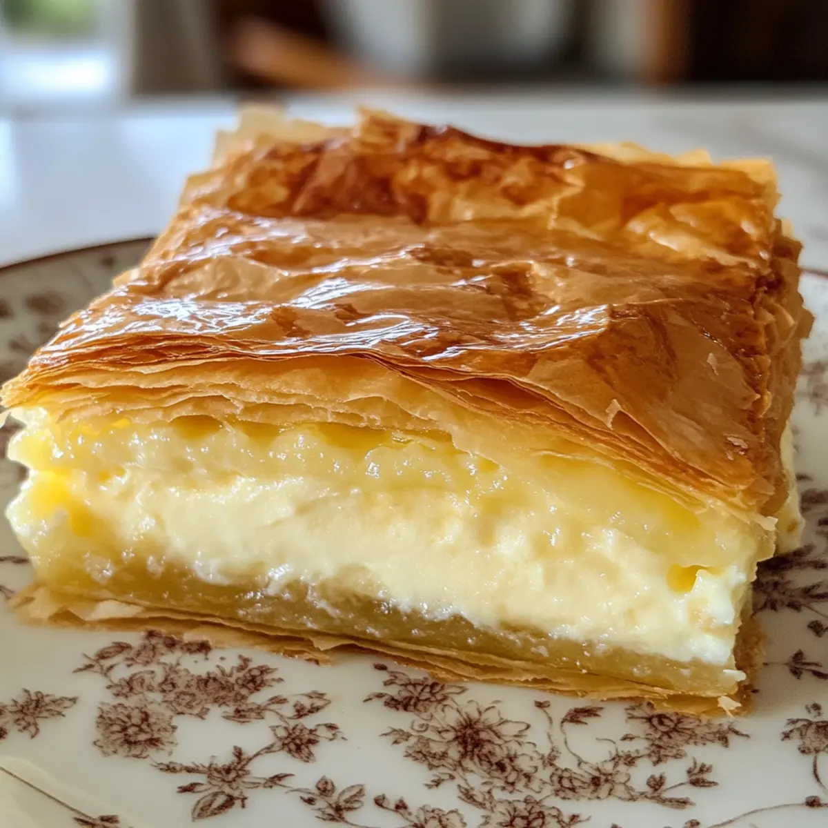 Cutting: When ready to slice, make sure it is completely cooled to achieve neat pieces that showcase the luscious custard and flaky phyllo layers.
