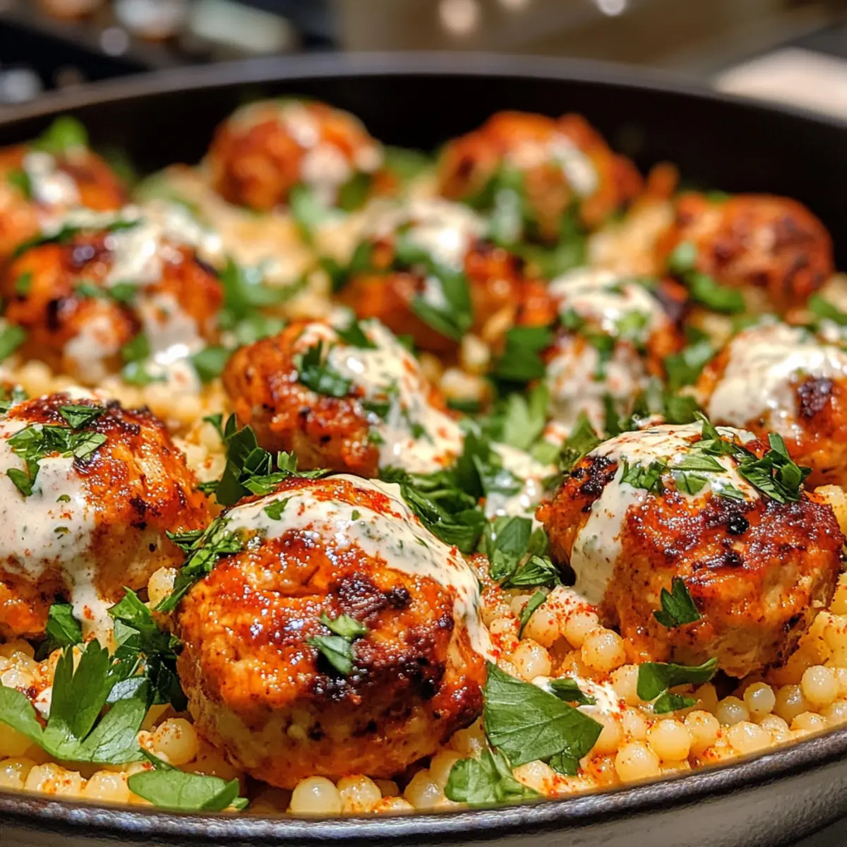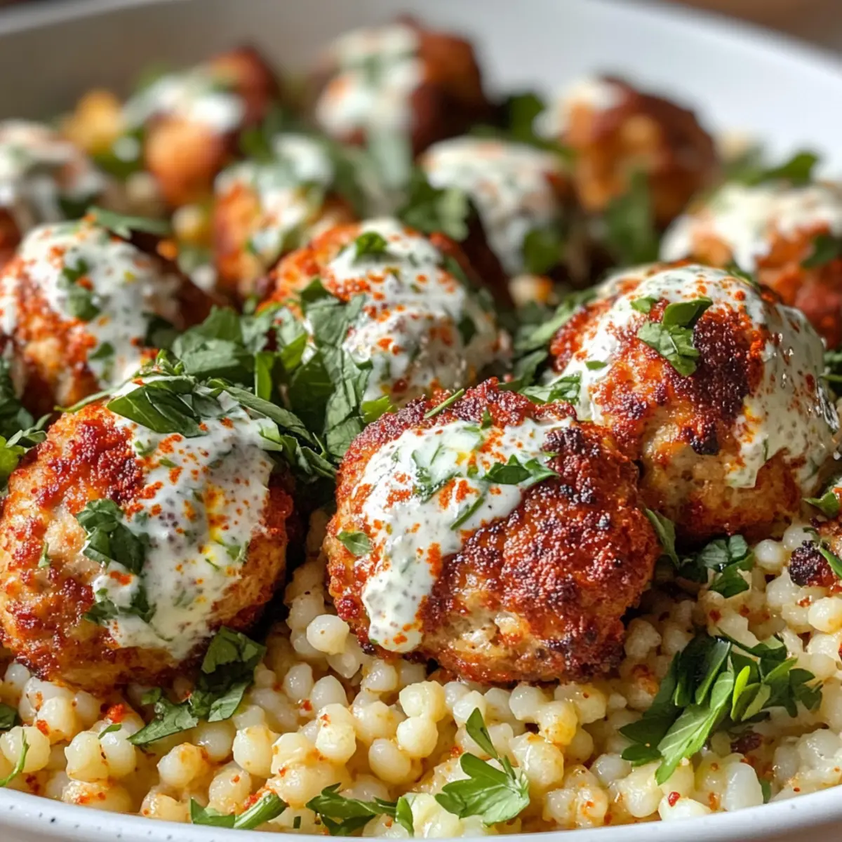- Plate the couscous and top with meatballs, drizzling with yogurt sauce before serving.