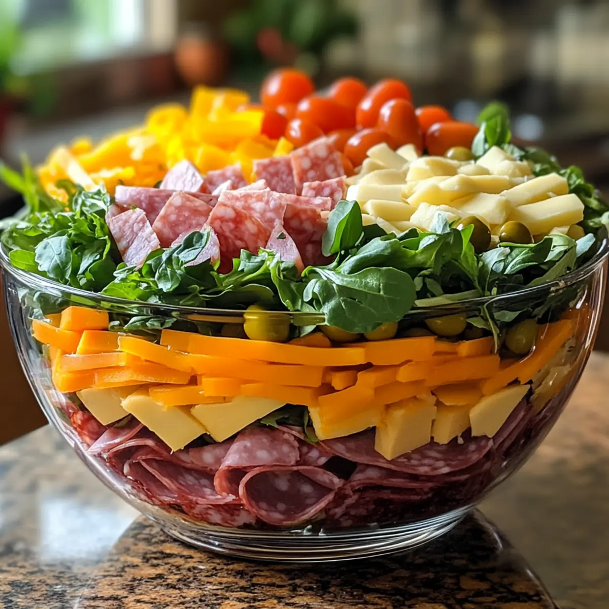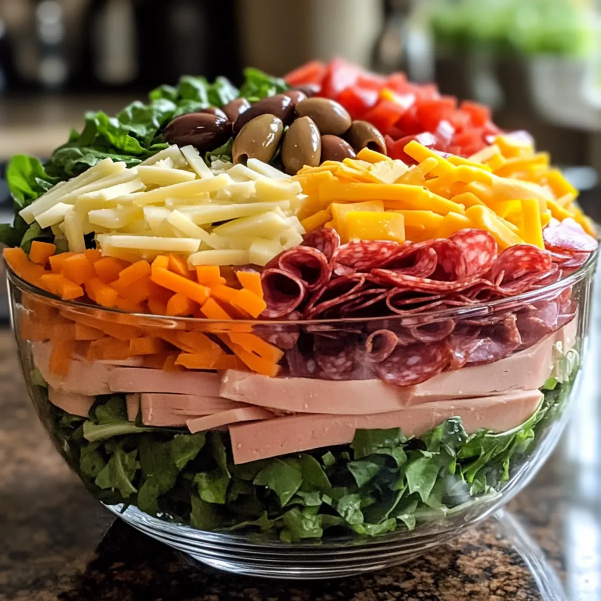 Visual Appeal: This salad is a feast for the eyes, with vibrant layers of greens, meats, and cheeses that make it the star of any table.