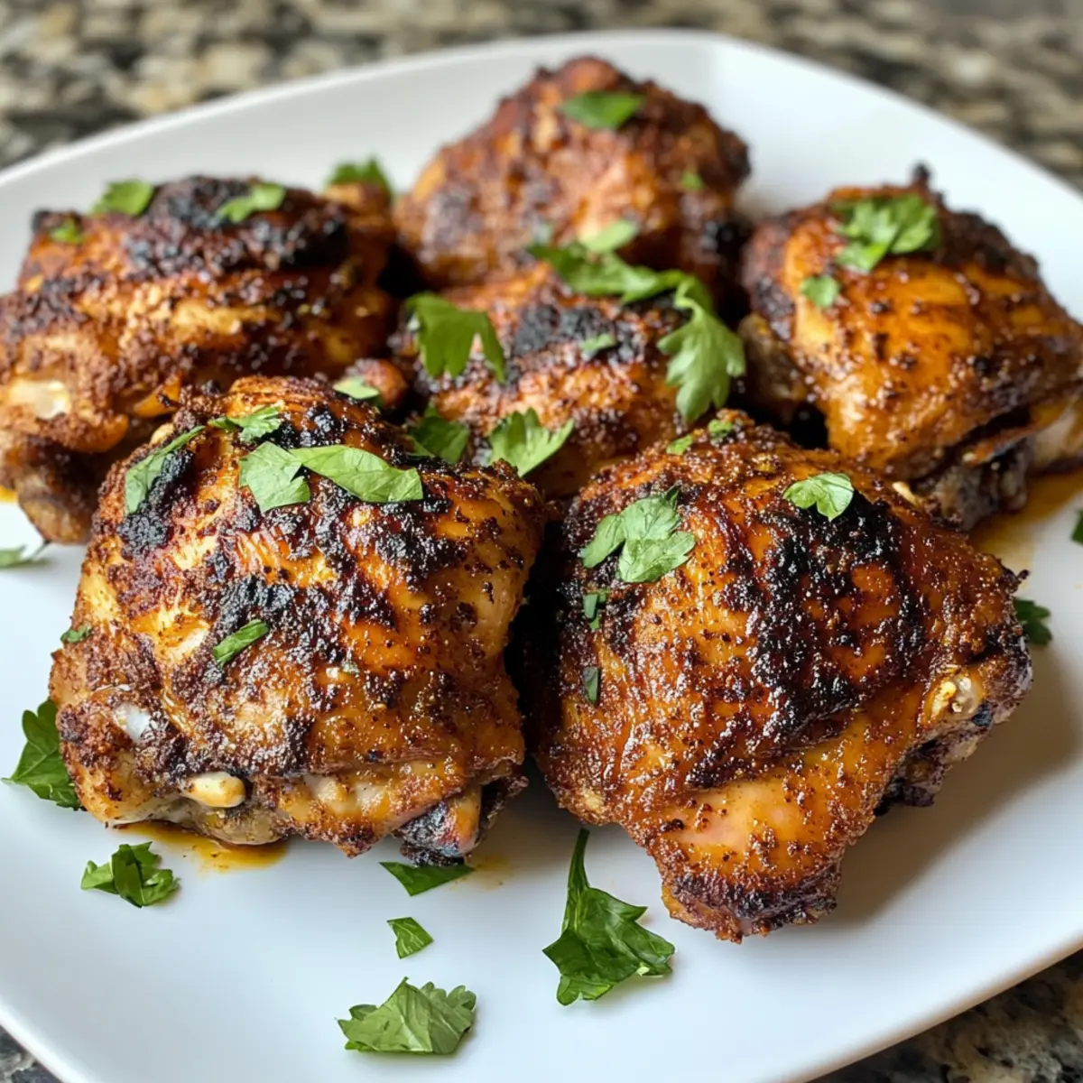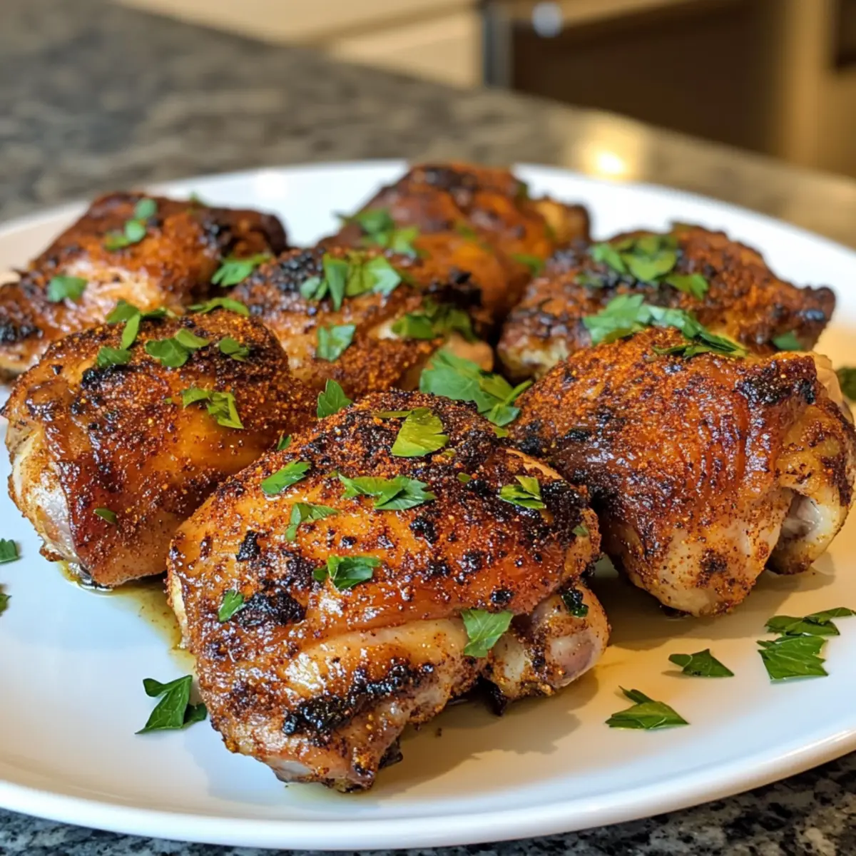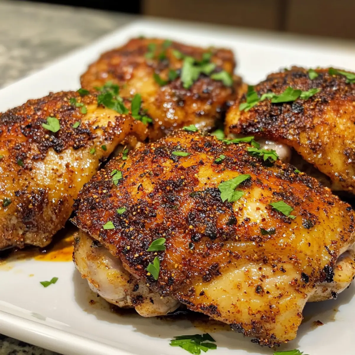 Once seared, transfer the chicken thighs to a parchment-lined baking sheet. Preheat your oven to 350°F (175°C) and bake the chicken for approximately 15 minutes. Keep an eye on the internal temperature, ensuring it reaches 165°F (74°C) for perfectly juicy, tender chicken. The warm, inviting aroma will fill your kitchen as the spices infuse the meat.