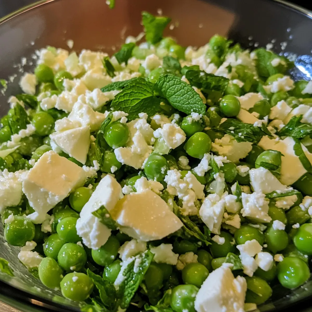 - In a large mixing bowl, add the cooled peas, crumbled feta cheese, and chopped fresh mint leaves.