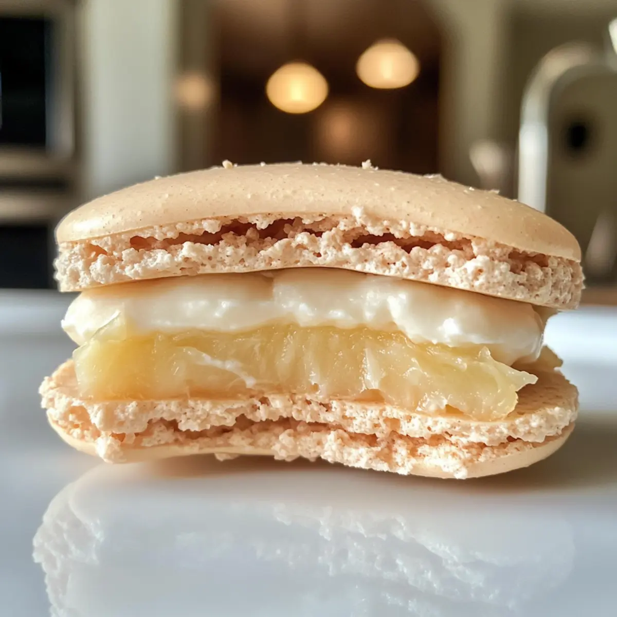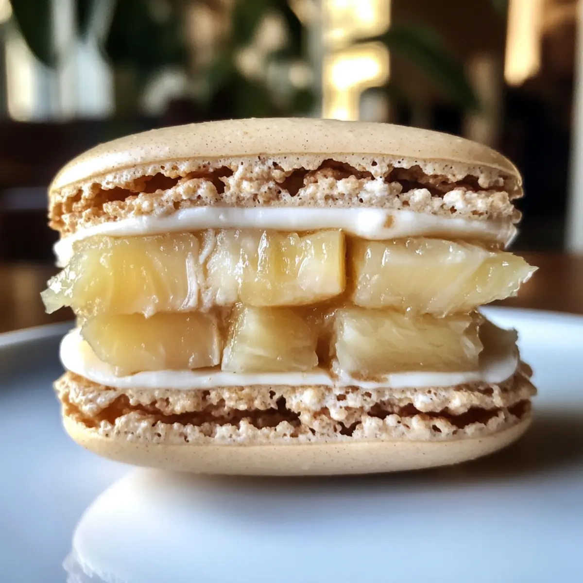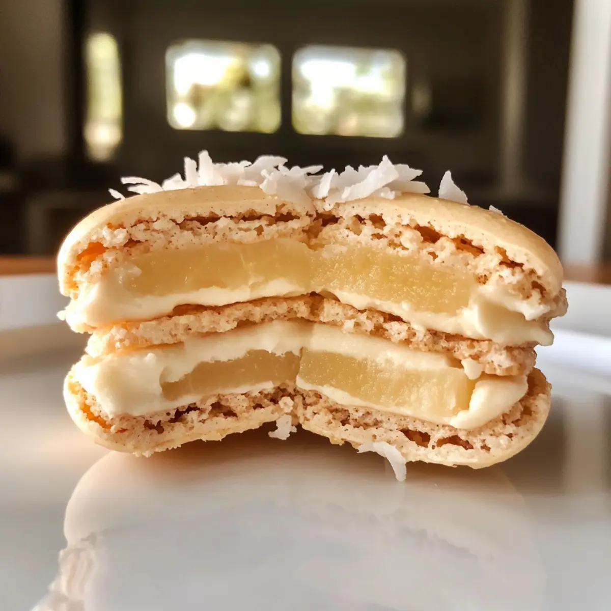 - Assemble: Pipe coconut ganache and pineapple confit between macaron shells, then sandwich.
