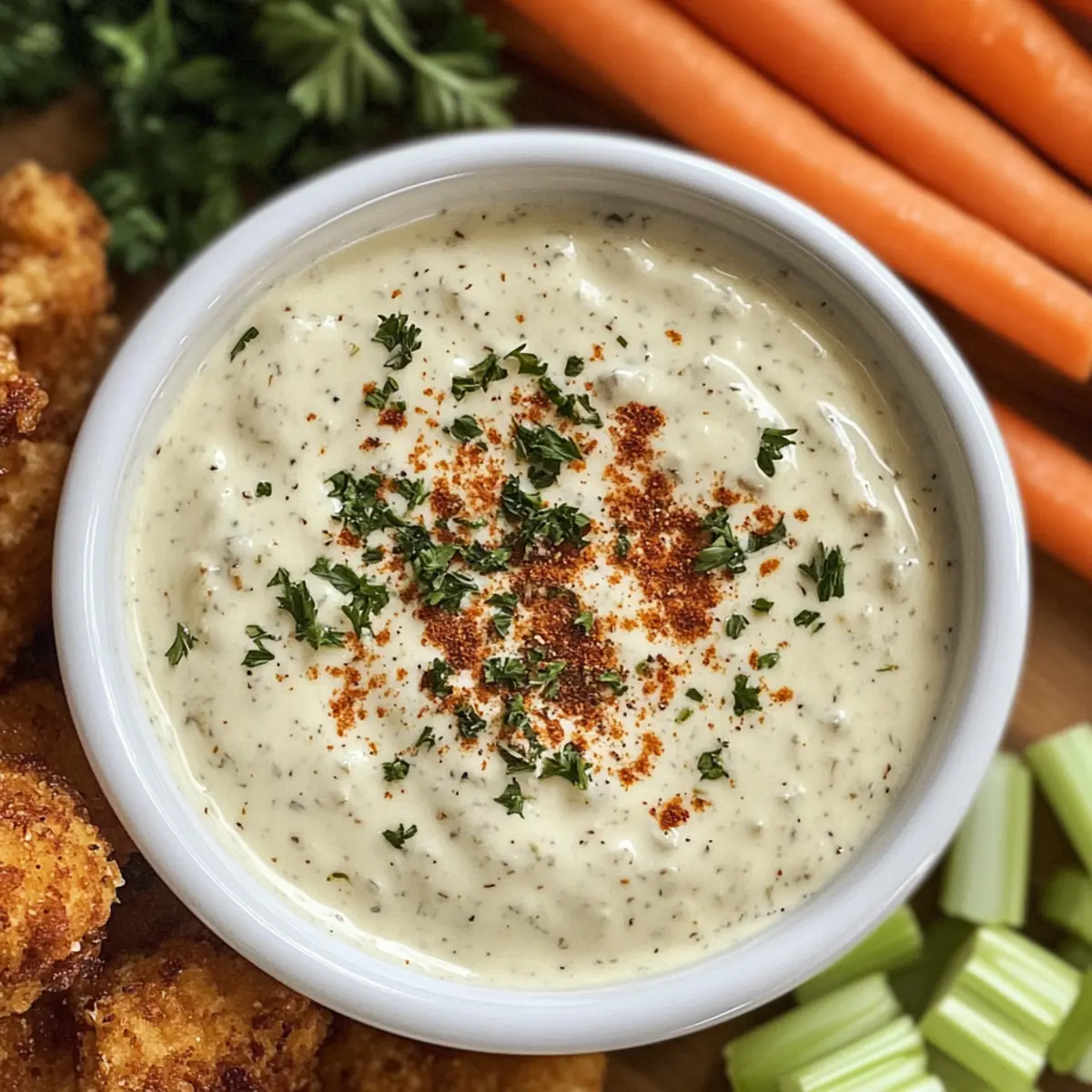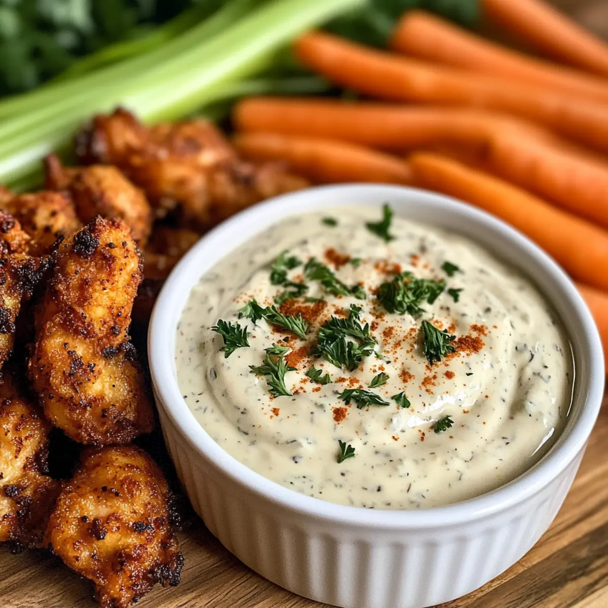 • Fresh Veggie Platter: Carrots, cucumbers, and bell peppers dipped in the rich ranch provide a crunchy, healthful balance to your indulgent treat.