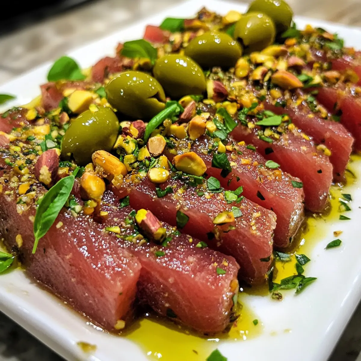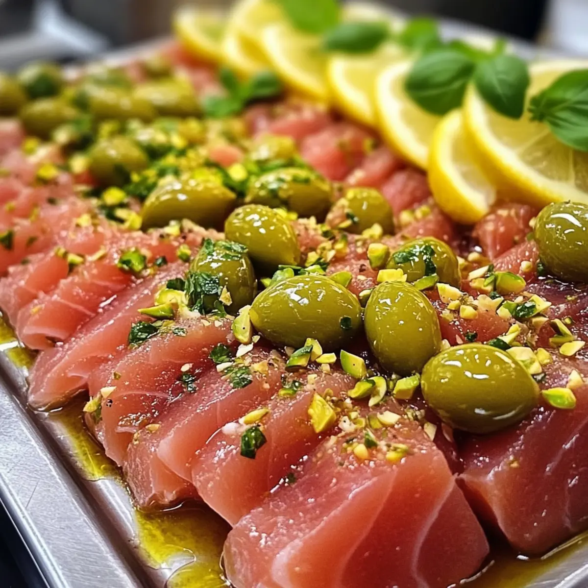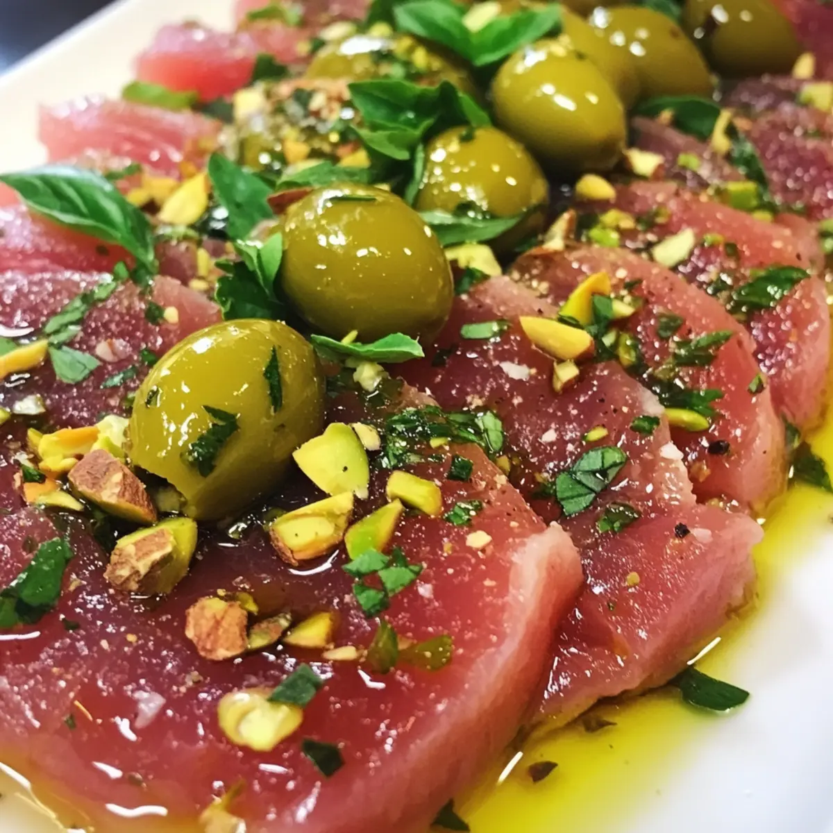- Finely chop the Castelvetrano olives and sprinkle them over the tuna slices, followed by chopped pistachios and fresh lemon zest.