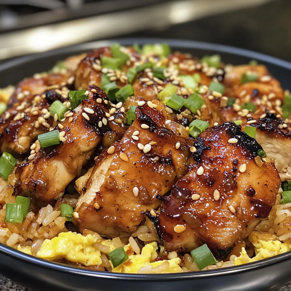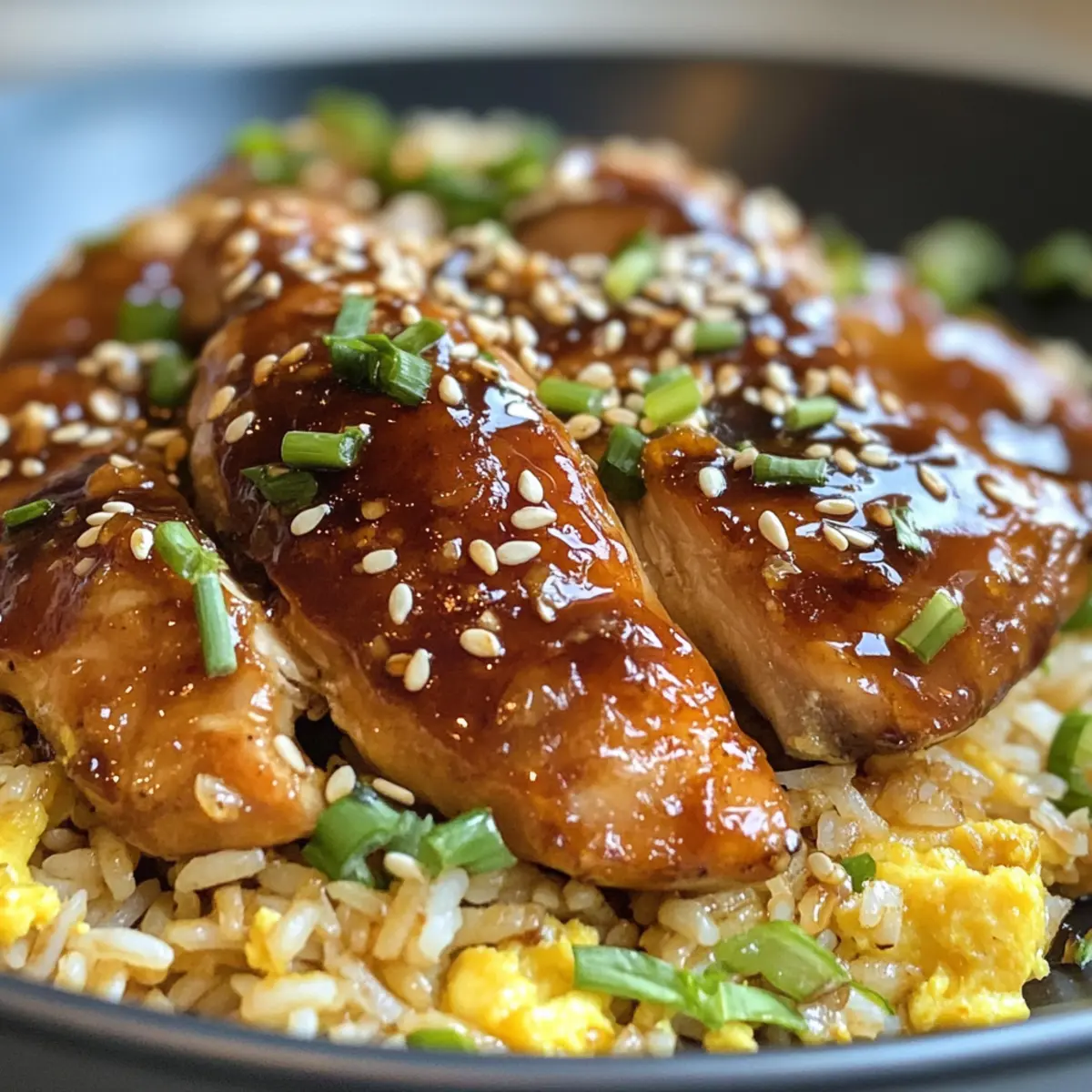 - Once the chicken is cooked through, plate it over the egg fried rice and drizzle any remaining sauce from the pan on top.
