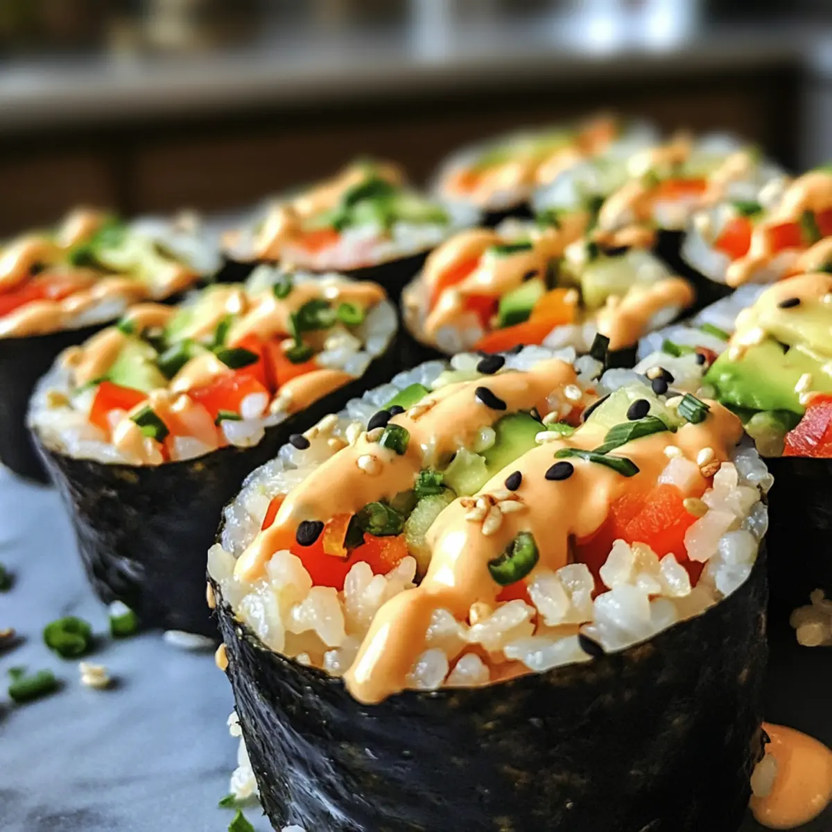 Once the rice cups have set, remove them from the refrigerator. Carefully lift them out of the muffin tin or silicone liners. Spoon the veggie mixture into each rice cup, filling them generously but not overflowing. Finally, drizzle a generous amount of spicy mayo over the top of each cup and finish with a sprinkle of black sesame seeds for an extra touch of flavor and crunch.