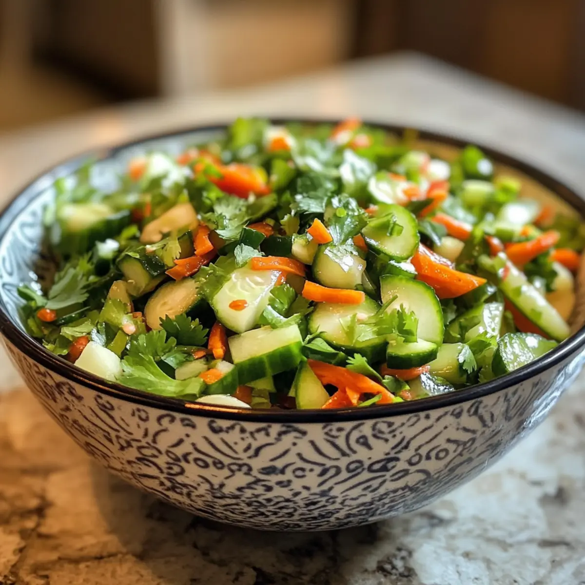 After thoroughly mixing, give your Tiger Salad a taste—adjust seasoning by adding a touch more salt or vinegar if needed. Allow the salad to sit for about 2 minutes, letting the flavors meld together. Serve immediately on a vibrant plate or bowl, showcasing its colorful crunch, perfect as a refreshing appetizer or light lunch option.