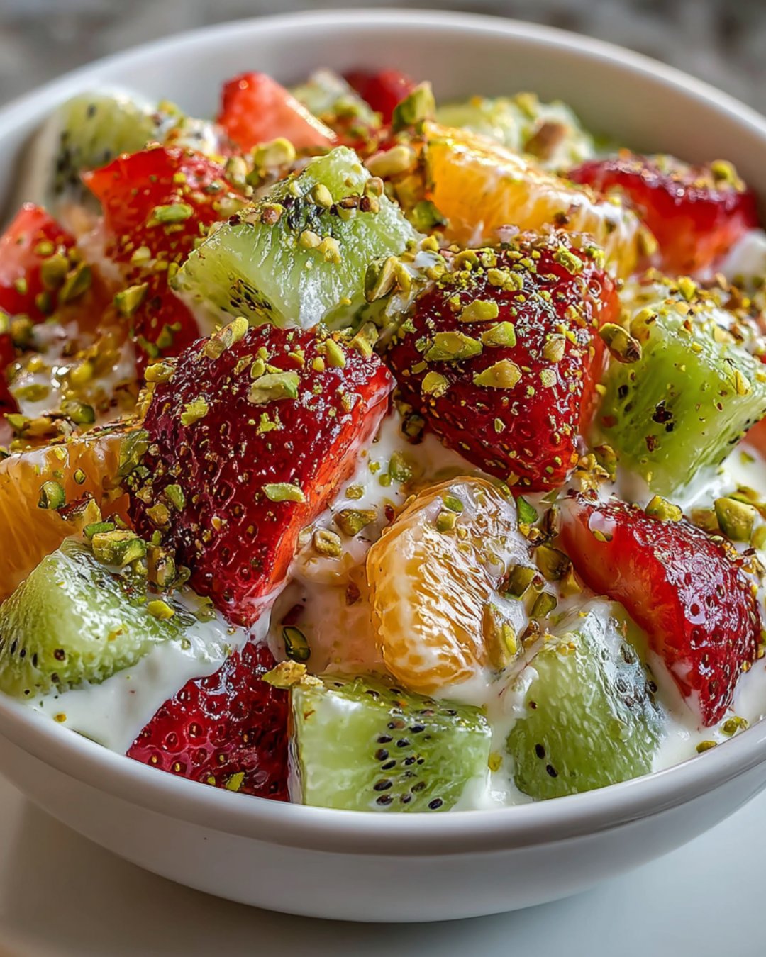 Now comes the fun part! Add your diced fresh fruit and chopped pistachios to the bowl. If you’re feeling adventurous, sprinkle in some shredded coconut too. Gently mix everything together, making sure the fruit is evenly distributed. Each bite should be a delightful surprise of flavors and textures. It’s like a party in a bowl!